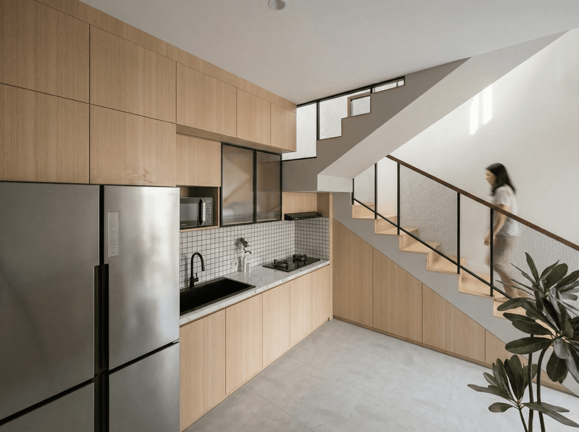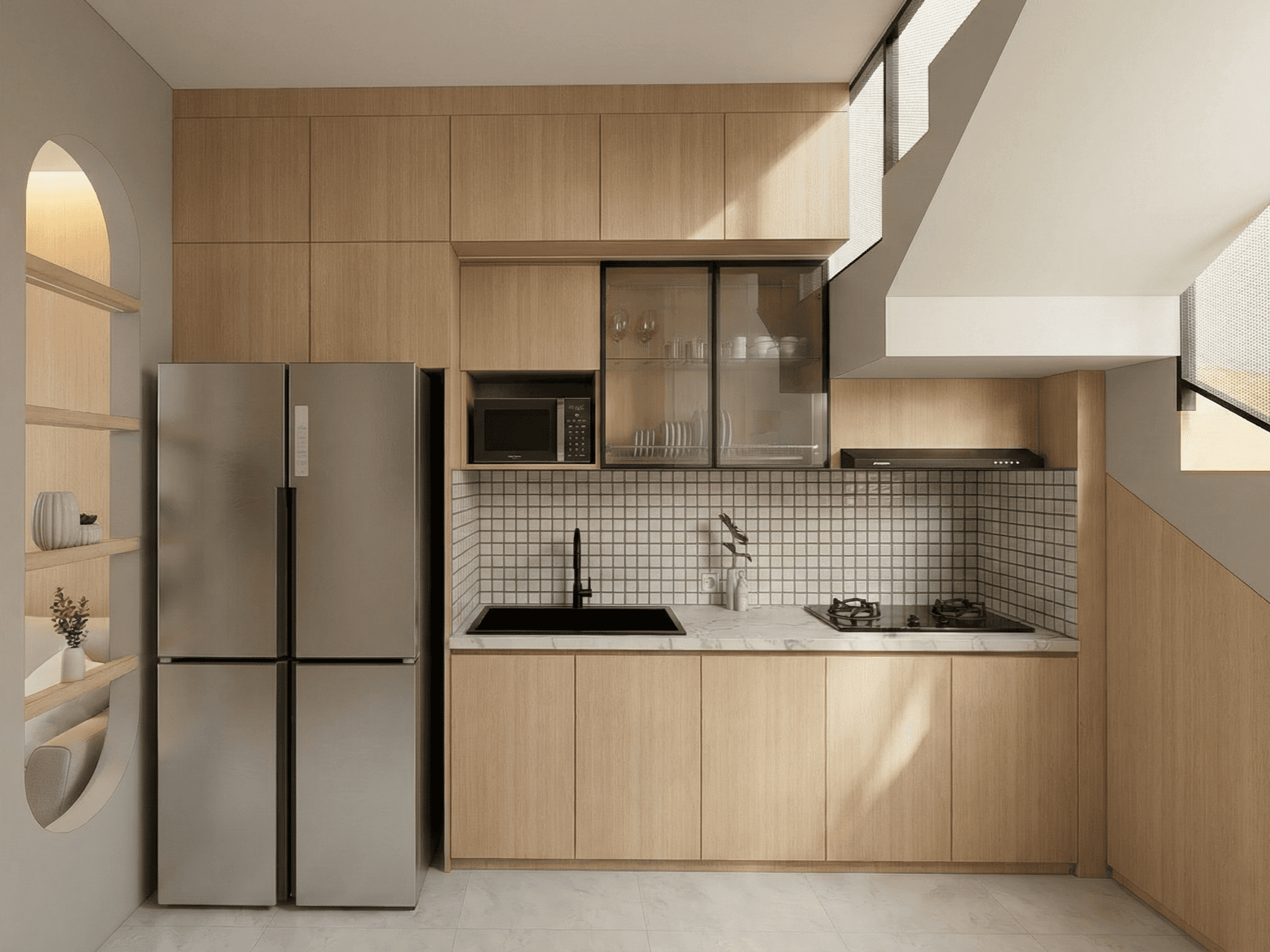 Desain interior fungsional dan elegan, dipadukan dengan pemilihan material dan detail yang realistis untuk dibangun dan dirawat dalam jangka panjang.